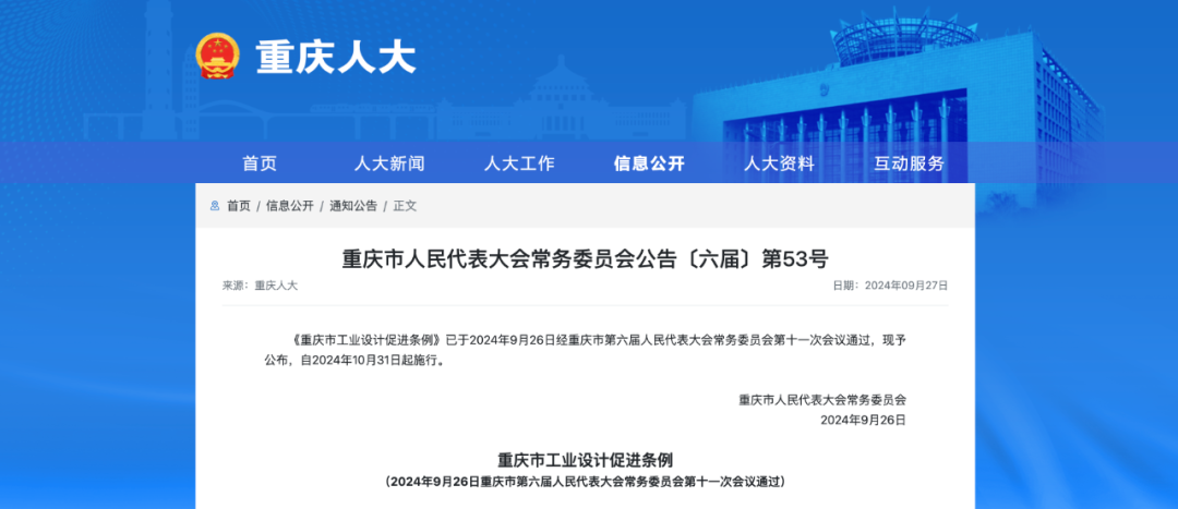 《重庆市工业设计促进条例》已于2024年9月26日经重庆市第六届人民代表大会常务委员会第十一次会议通过,现予公布,自2024年10月31日起施行。(2024年9月26日重庆市第六届人民代表大会常务委员会第十一次会议通过)